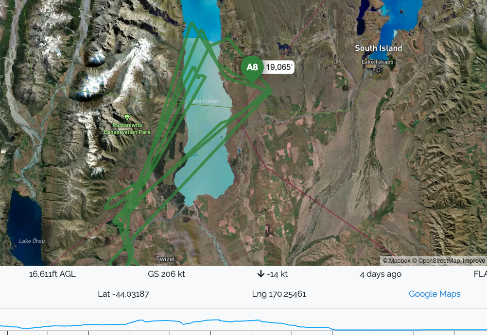 Dane's track shows he flew the task 3 times. The screen shot below shows Dane on the downwind leg at 19,000' with a remarkable ground speed of 381km/hr.