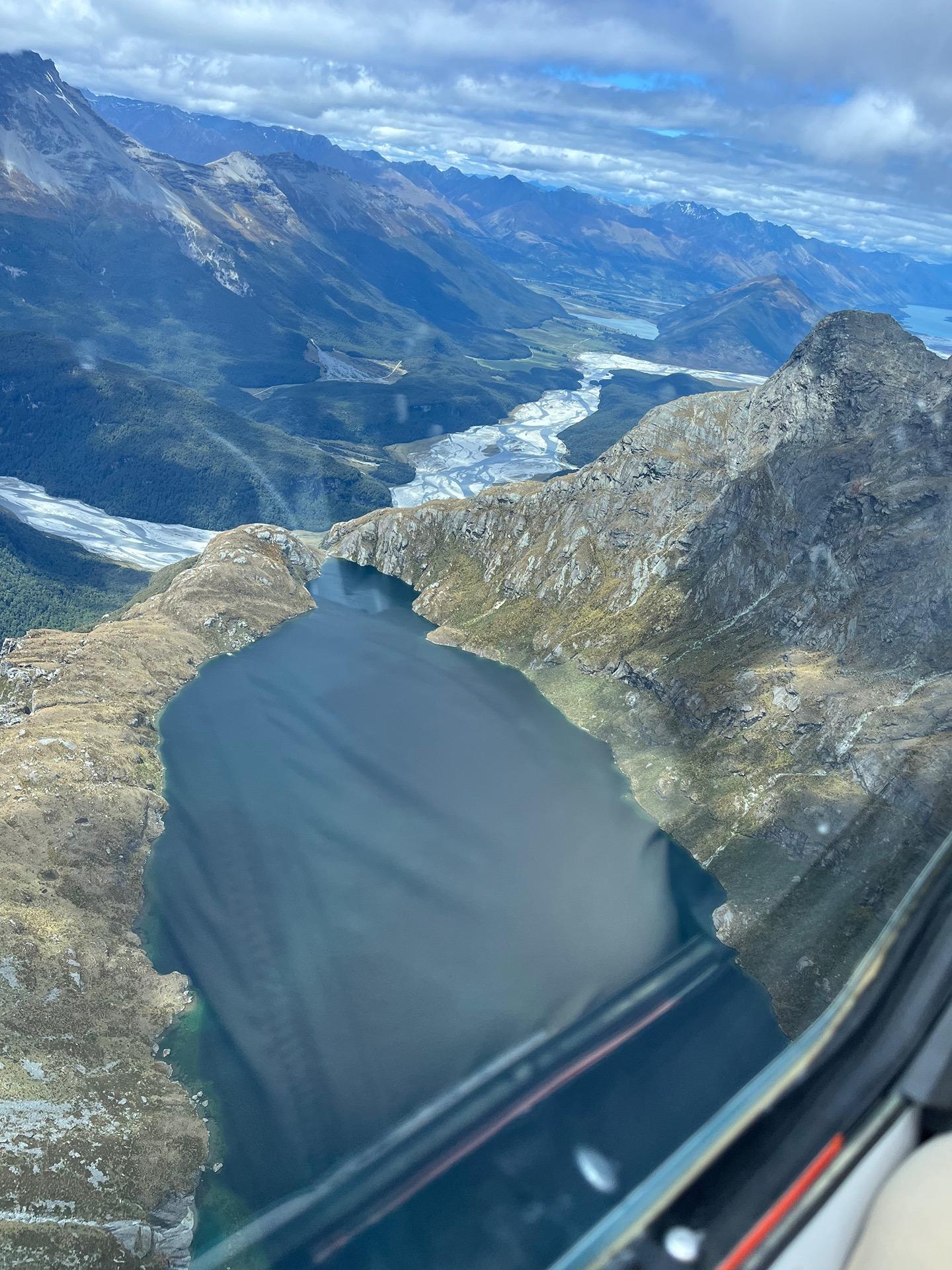 Ben and Justin check out Lake Unknown (real name). Looking down the Dart River to Glenorchy and Lake Wakatipu beyond.